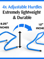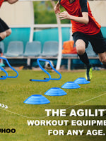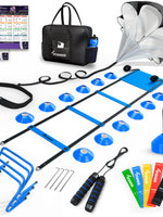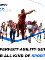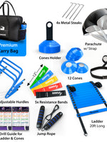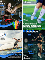STUHOO brings the passionate athletes & fitness freaks a versatile soccer training equipment that includes 20 ft Agility Ladder, Parachute for speed training, Jump Rope, 4 Adjustable Hurdles, 5 Resistance Bands, 12 Disc Cones with holder, 2 Double-Sided Drill Guides, and a Gym Bag; our football training equipment comes with a passion to make your life more fitter